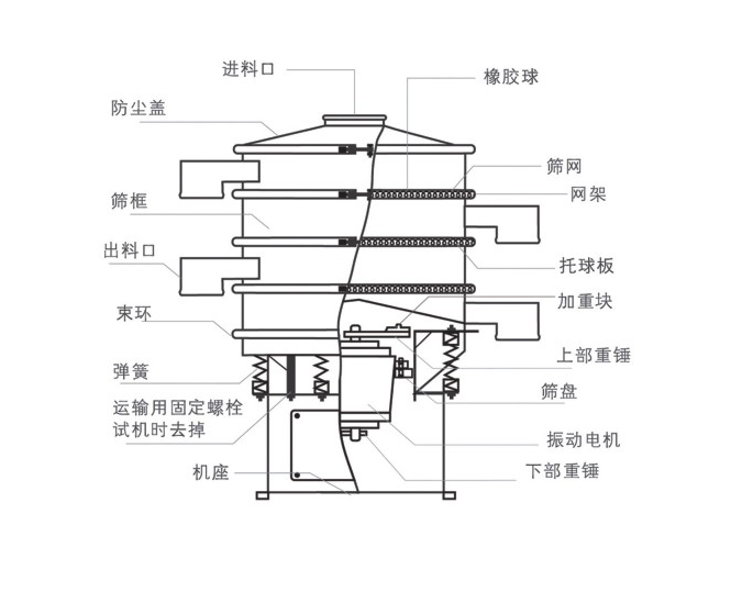 該設(shè)備由直立式電機(jī)作激振源,電機(jī)上、下兩端安裝有偏心重錘,將電機(jī)的旋轉(zhuǎn)運(yùn)動(dòng)轉(zhuǎn)變?yōu)樗健⒋怪?、傾斜的三次元運(yùn)動(dòng),再把這個(gè)運(yùn)動(dòng)傳遞給篩面。調(diào)節(jié)上、下兩端的相位角,可改變物料在篩面上的運(yùn)動(dòng)軌跡。